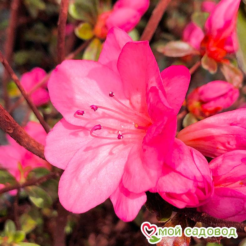Азалия японская — плотный, компактный куст. У него круглые и слегка блестящие листья, которые во время мягких зим не опадают. Но самая большая гордость азалии японской — её цветки. Эти растения универсальны и подходят практически для любого сада. Невысокий вечнозеленый кустарник. Цветки розовые с лососевым оттенком. Обильное цветение. Хорошо зимует под снегом, морозостойкость достаточная для выращивания в средней полосе России. Весной необходимо притенять, чтобы уберечь листья от иссушения. Цветение ежегодное, обильное. Очень изящная и компактная, эта красивая приземистая вечнозеленая азалия может расти в саду любого размера, также ее можно высадить в контейнер, наполненный компостом для вересковых.