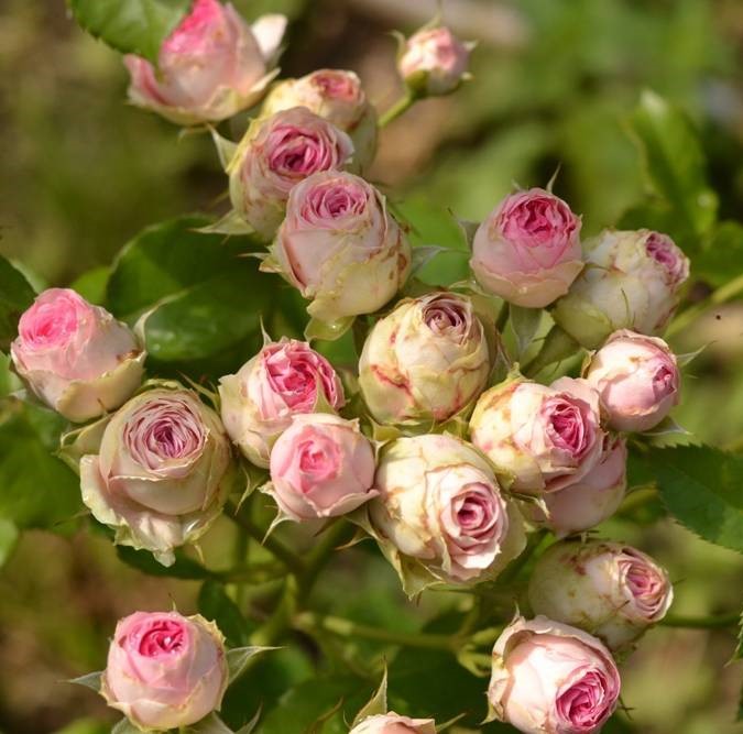 Роза Мими Эден Представленный на фото каталога сорт выведен в 2001 году во Франции. Для этого селекционеры скрестили полиантовую и чайную розы. Растение встречается под производственным наименованием MEIptipier. Ботаническое описание Мими Эден – аккуратный кустик, высота которого достигает не более 85 см (чаще в пределах 50 см). Со временем он довольно хорошо разрастается в диаметре. Стебли плотные, с минимальным количеством шипов. Листва глянцевая, некрупная, ярко-зелёного цвета. Со средины лета и до осенних заморозков саженцы радуют глаз обильным цветением. Обычно на цветоножке образуется 5 – 10 бутонов. Последние раскрываются постепенно, сменяя друг друга. Набитие лепестков достаточно плотное (в каждом цветке от 27 до 40 штук). Соцветия шарообразной формы, двухцветные. Сердцевинка бледно-розовая, густомахровая, с бело-зелёной окантовкой. Диаметр полностью раскрывшегося цветка не превышает 5 см. Роза источает слабый аромат, с лёгкими цветочными нотками. Применение Роза Мими Эден может использоваться для контейнеров и бордюров. Многие цветоводы выращивают многолетник в саду или для срезки. Растение достойно украсит не только частную территорию, но и зону отдыха в парках и скверах. Агротехника Под посадку розы Мими Эден отводят хорошо освещённые места. Поскольку куст широко разрастается, не лишней будет организация опоры. Рассаду можно размещать группками, на расстоянии 50 см друг от друга. Также на развитие многолетника влияет состав почвы. Для полноценного роста цветам нужен питательный, рыхлый и воздухопроницаемый субстрат. По уходу рекомендуется соблюдать несколько простых правил. К примеру, обеспечить рассаде умеренный полив тёплой и отстоянной водой. После процедуры важно разрыхлить землю вокруг кустов, чтобы не образовывалась корка. Розы Мими Эден обильно и длительно цветут после внесения фосфорно-калийных подкормок. Удобрения желательно использовать 2 раза за сезон — в осенний и весенний период. Перед началом морозного сезона саженцы надо утеплить. Особенно это касается молодых, неокрепших экземпляров (в первые годы после посадки). С этой целью кустики окучивают грунтом на значительную высоту. Слишком длинные побеги аккуратно пригибают и фиксируют металлическими скобами. Под стебли подстилают еловый лапник, чтобы растение не соприкасалось с влагой. Далее розу накрывают теплоизоляционным материалом – лутрасилом, спанбондом или агроволокном. Для размножения сорта Мими Эден тонкую и гибкую макушку побега не используют. Её нужно состричь острым секатором. Оставшийся стебель, диаметром приблизительно в 0,5 см, нарезают на черенки. С одного побега можно получить 1 – 2 черенка (в зависимости от длины). Преимущества розы Мими Эден У рассматриваемого сорта розы-спрей много положительных качеств. Например, это: хорошая морозостойкость (выдерживает температуру до -26 ˚С); длительный период цветения. Начинается он со средины июня и заканчивается во второй половине сентября. В течение этого времени роза выпускает 2 – 3 волны с интервалом в 14 дней; оригинальная двухцветная окраска лепестков; лёгкий, ненавязчивый аромат; минимальное количество шипиков на побегах; компактные размеры куста. Купить рассаду сорта Мими Эден можно не только в торговых организациях и магазинах, занимающихся облагораживанием садово-парковых зон. Качеств